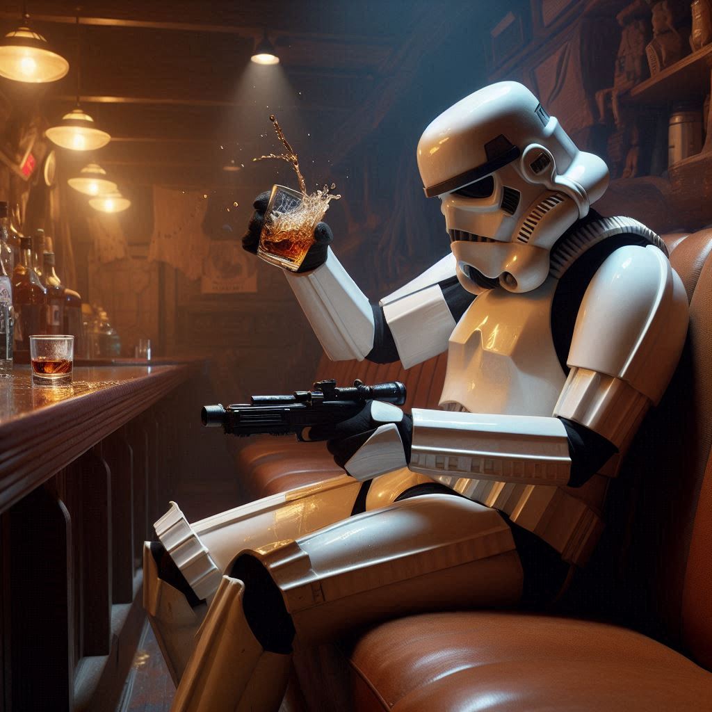 142.3 KB 1024 x 1024 | Oct 5 2024 11:54 PM CST | The StormTrooper trying to drink from a shot glass, and misses. | ||